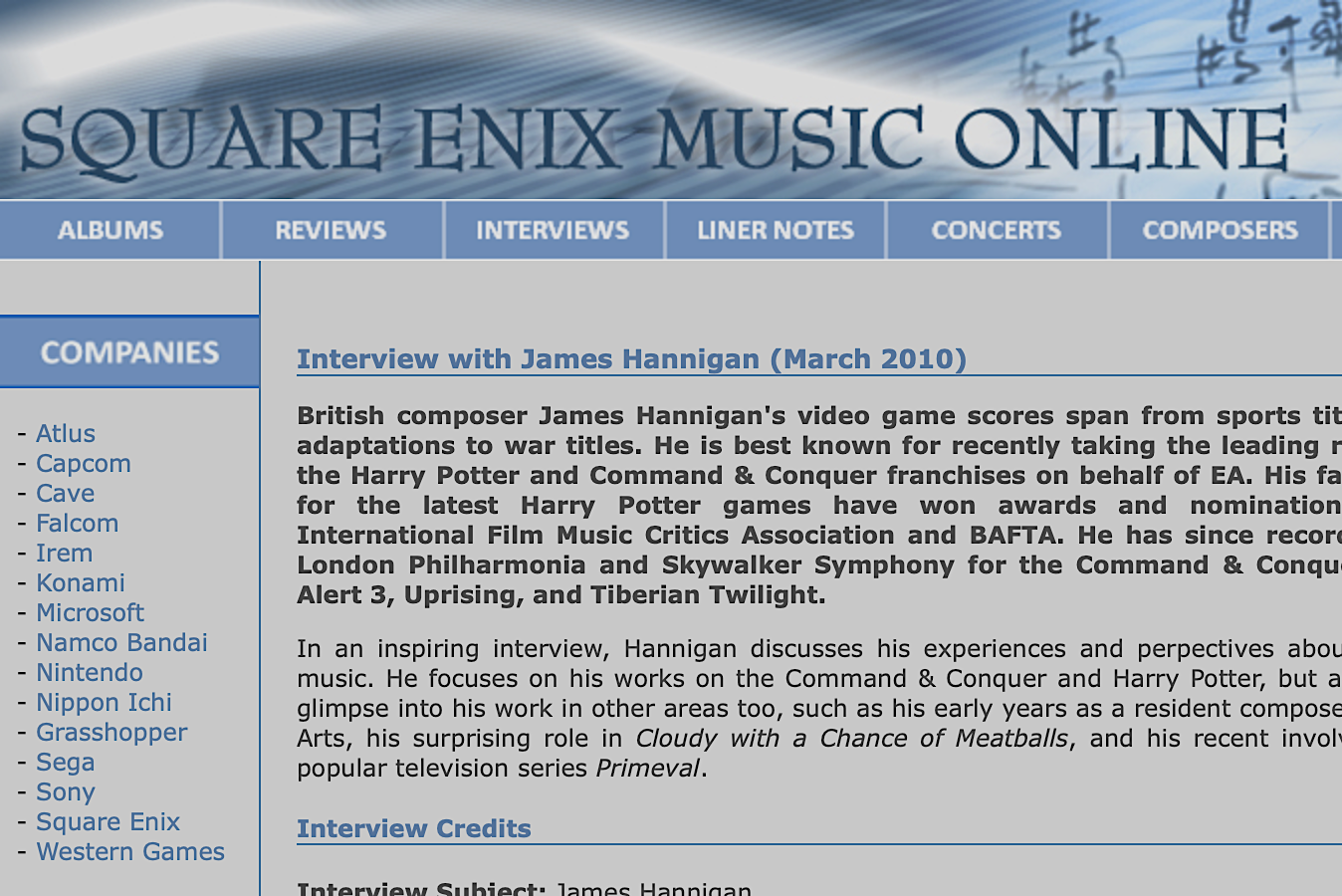 Square Enix Music Online – Interview Square Enix Music Online interviews James Hannigan – March 2010 Category